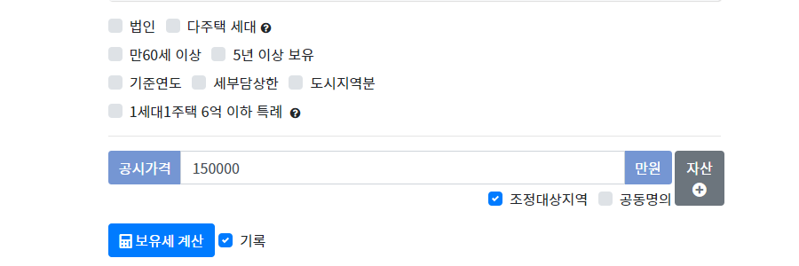 위에 이미지처럼 공시가격을 입력하고 조정대상지역인지 여부를 체크하고
