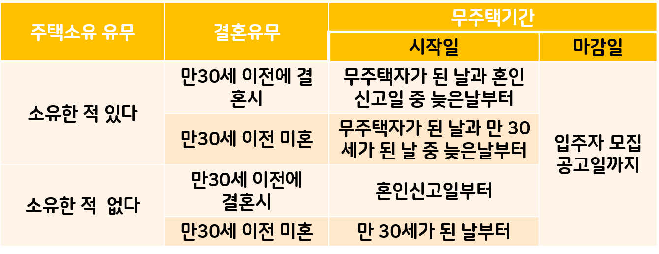 무주택기간은 청약신청자 본인 및 배우자를 기준으로 산정되며, 만 30세가 무주택기간 가점이 산정되는 기준이다.