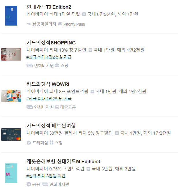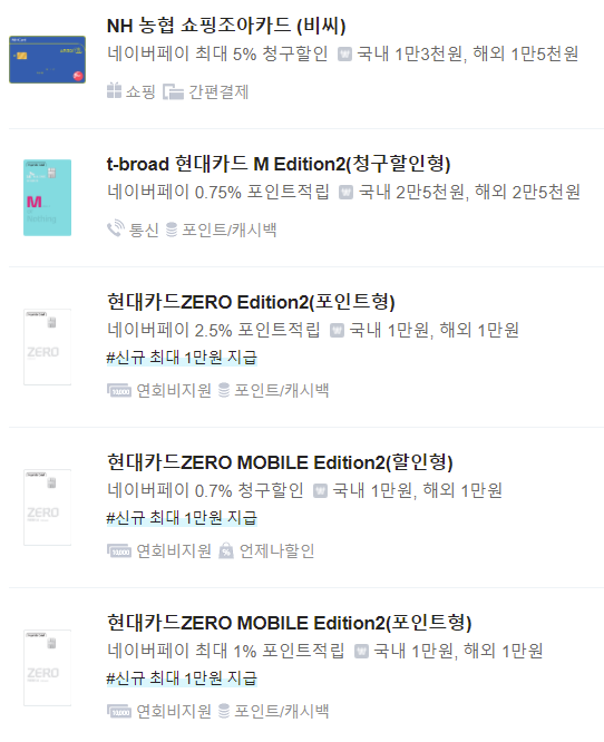 이외에 네이버페이의 사용량이 높기 때문에 관련 옵션이 붙은 카드들이 상당히 많다.